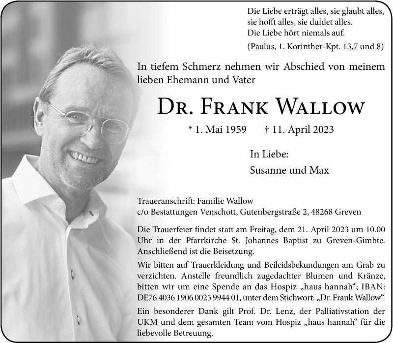 Hier finden Sie alle Traueranzeigen aus der Zeitung, die bisher für Dr. Frank Wallow erschienen sind. Weitere Traueranzeigen, die in der Zeitung erscheinen, werden hier ebenfalls aufgelistet