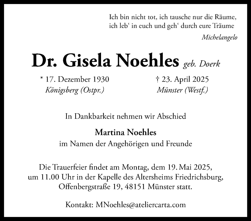Hier finden Sie alle Traueranzeigen aus der Zeitung, die bisher für Dr. Gisela Noehles erschienen sind. Weitere Traueranzeigen, die in der Zeitung erscheinen, werden hier ebenfalls aufgelistet