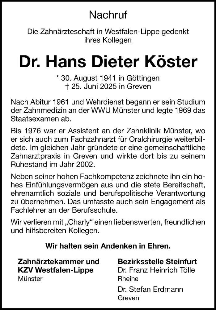 Hier finden Sie alle Traueranzeigen aus der Zeitung, die bisher für Dr. Hans Dieter Köster erschienen sind. Weitere Traueranzeigen, die in der Zeitung erscheinen, werden hier ebenfalls aufgelistet