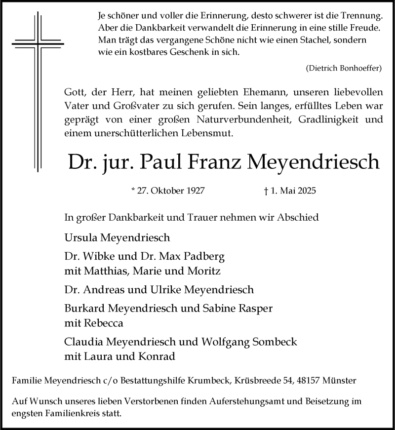 Hier finden Sie alle Traueranzeigen aus der Zeitung, die bisher für Dr. jur. Paul Franz Meyendriesch erschienen sind. Weitere Traueranzeigen, die in der Zeitung erscheinen, werden hier ebenfalls aufgelistet