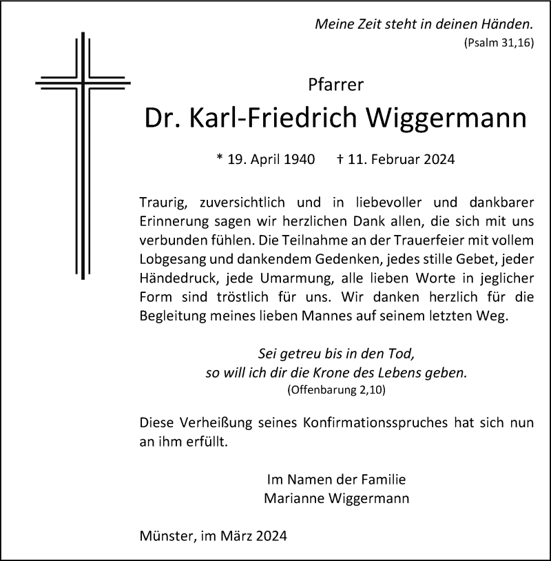 Hier finden Sie alle Traueranzeigen aus der Zeitung, die bisher für Dr. Karl-Friedrich Wiggermann erschienen sind. Weitere Traueranzeigen, die in der Zeitung erscheinen, werden hier ebenfalls aufgelistet