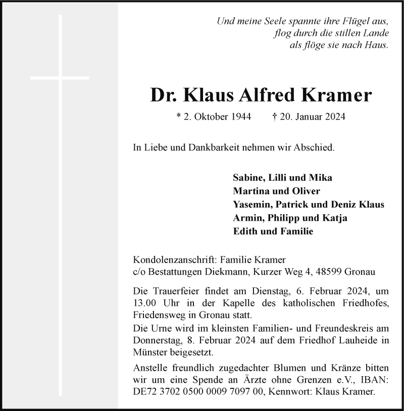 Hier finden Sie alle Traueranzeigen aus der Zeitung, die bisher für Dr. Klaus Alfred Kramer erschienen sind. Weitere Traueranzeigen, die in der Zeitung erscheinen, werden hier ebenfalls aufgelistet