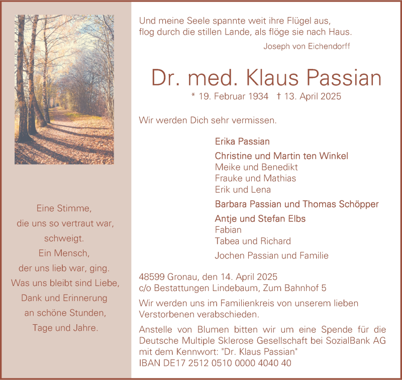 Hier finden Sie alle Traueranzeigen aus der Zeitung, die bisher für Dr. med. Klaus Passian erschienen sind. Weitere Traueranzeigen, die in der Zeitung erscheinen, werden hier ebenfalls aufgelistet
