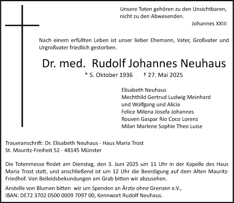 Hier finden Sie alle Traueranzeigen aus der Zeitung, die bisher für Dr. med. Rudolf Johannes Neuhaus erschienen sind. Weitere Traueranzeigen, die in der Zeitung erscheinen, werden hier ebenfalls aufgelistet