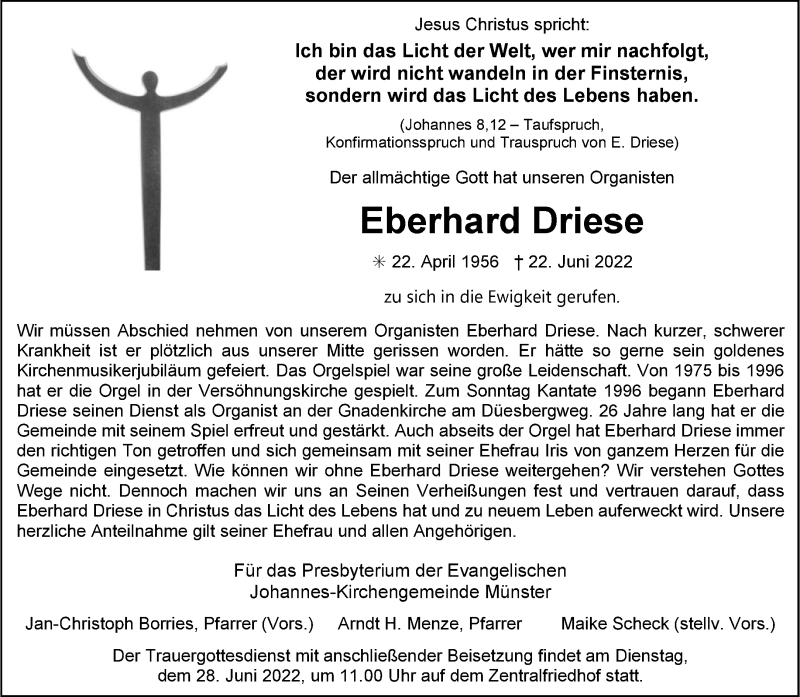 Hier finden Sie alle Traueranzeigen aus der Zeitung, die bisher für Eberhard Driese erschienen sind. Weitere Traueranzeigen, die in der Zeitung erscheinen, werden hier ebenfalls aufgelistet