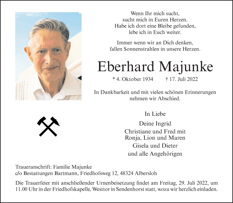 Hier finden Sie alle Traueranzeigen aus der Zeitung, die bisher für Eberhard Majunke erschienen sind. Weitere Traueranzeigen, die in der Zeitung erscheinen, werden hier ebenfalls aufgelistet