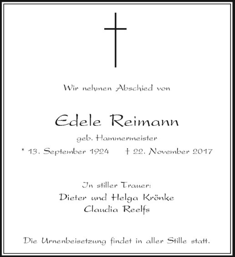 Hier finden Sie alle Traueranzeigen aus der Zeitung, die bisher für Edele Reimann erschienen sind. Weitere Traueranzeigen, die in der Zeitung erscheinen, werden hier ebenfalls aufgelistet