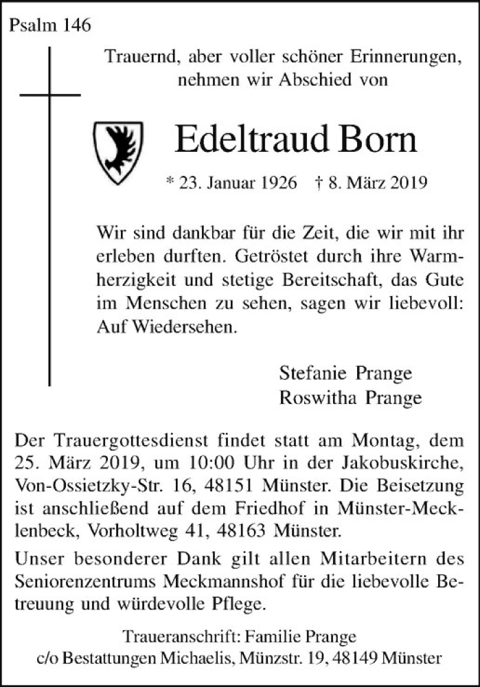 Hier finden Sie alle Traueranzeigen aus der Zeitung, die bisher für Edeltraud Born erschienen sind. Weitere Traueranzeigen, die in der Zeitung erscheinen, werden hier ebenfalls aufgelistet