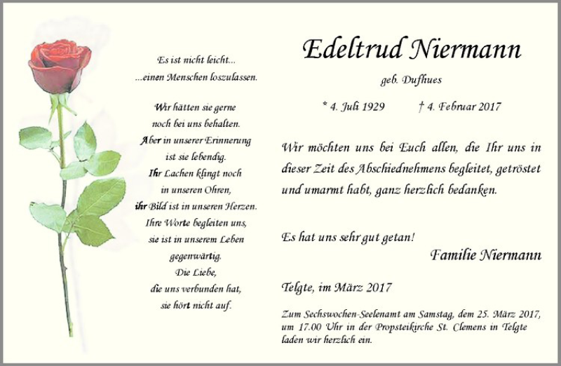 Hier finden Sie alle Traueranzeigen aus der Zeitung, die bisher für Edeltraud Niermann erschienen sind. Weitere Traueranzeigen, die in der Zeitung erscheinen, werden hier ebenfalls aufgelistet
