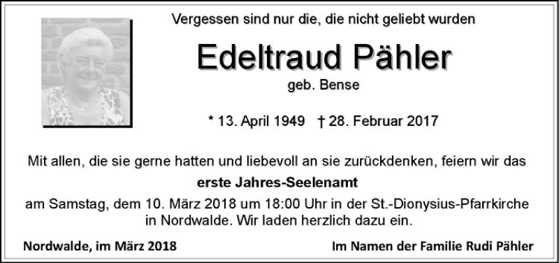 Hier finden Sie alle Traueranzeigen aus der Zeitung, die bisher für Edeltraud Pähler erschienen sind. Weitere Traueranzeigen, die in der Zeitung erscheinen, werden hier ebenfalls aufgelistet