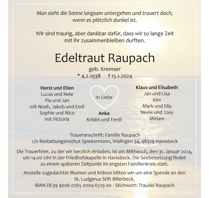 Hier finden Sie alle Traueranzeigen aus der Zeitung, die bisher für Edeltraut Raupach erschienen sind. Weitere Traueranzeigen, die in der Zeitung erscheinen, werden hier ebenfalls aufgelistet