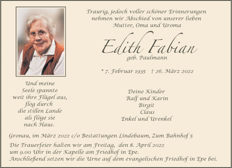Hier finden Sie alle Traueranzeigen aus der Zeitung, die bisher für Edith Fabian erschienen sind. Weitere Traueranzeigen, die in der Zeitung erscheinen, werden hier ebenfalls aufgelistet