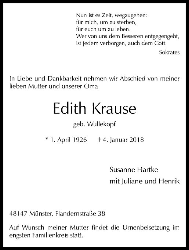 Hier finden Sie alle Traueranzeigen aus der Zeitung, die bisher für Edith Krause erschienen sind. Weitere Traueranzeigen, die in der Zeitung erscheinen, werden hier ebenfalls aufgelistet