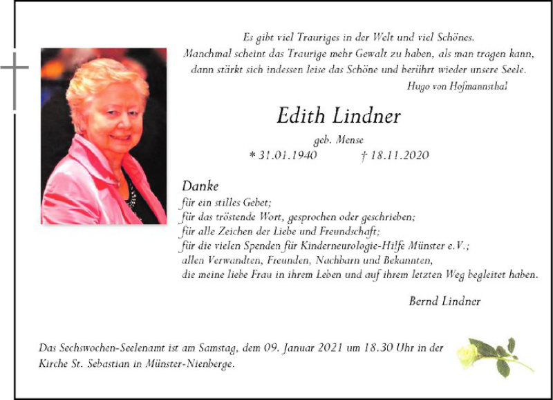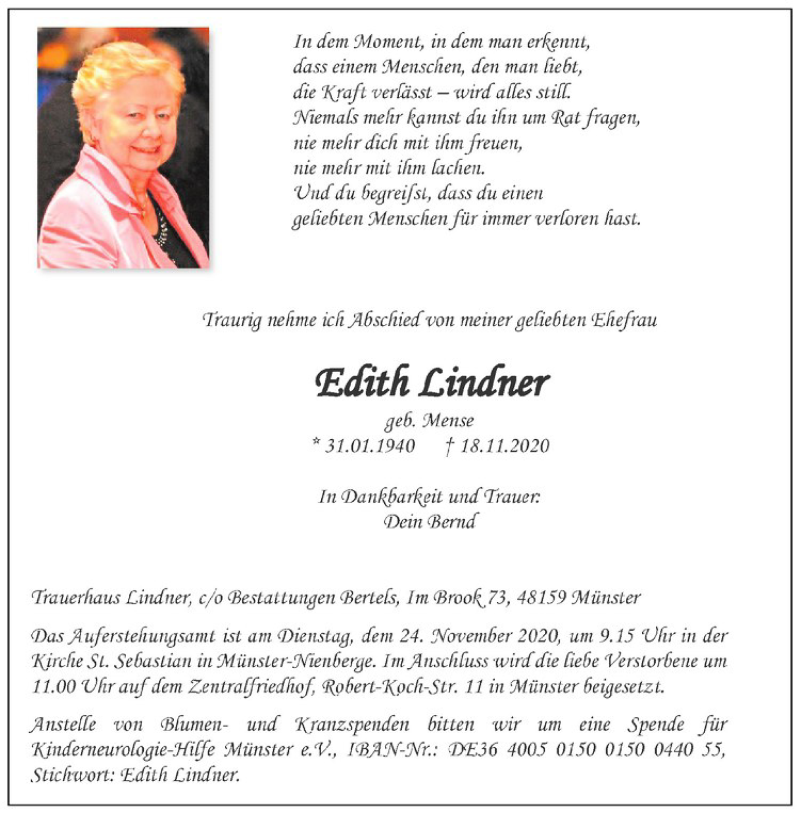 Hier finden Sie alle Traueranzeigen aus der Zeitung, die bisher für Edith Lindner erschienen sind. Weitere Traueranzeigen, die in der Zeitung erscheinen, werden hier ebenfalls aufgelistet