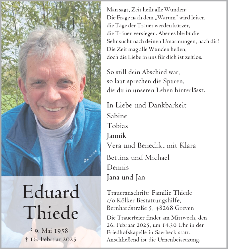 Hier finden Sie alle Traueranzeigen aus der Zeitung, die bisher für Eduard Thiede erschienen sind. Weitere Traueranzeigen, die in der Zeitung erscheinen, werden hier ebenfalls aufgelistet