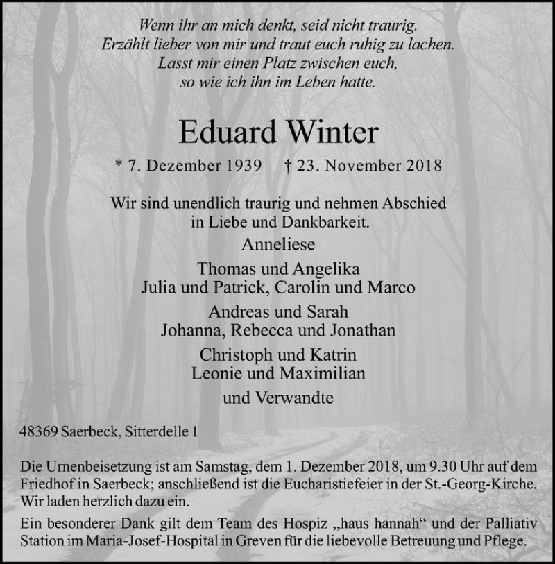 Hier finden Sie alle Traueranzeigen aus der Zeitung, die bisher für Eduard Winter erschienen sind. Weitere Traueranzeigen, die in der Zeitung erscheinen, werden hier ebenfalls aufgelistet