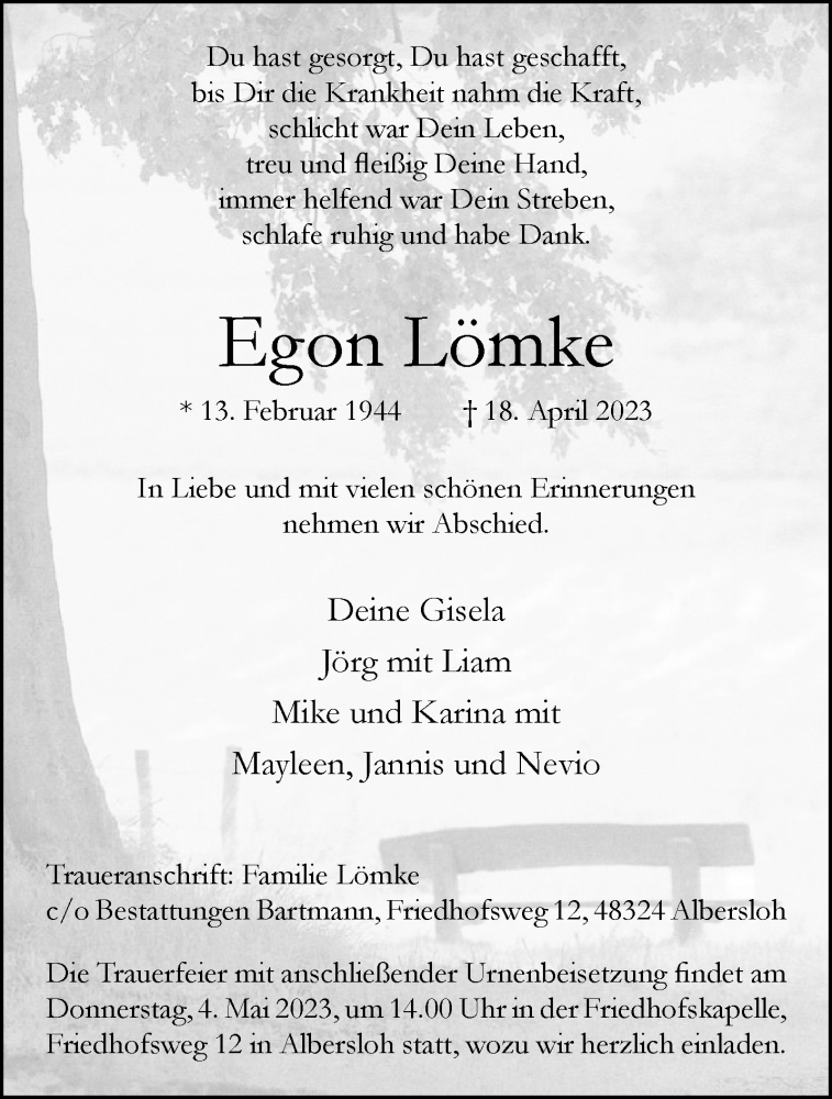 Hier finden Sie alle Traueranzeigen aus der Zeitung, die bisher für Egon Lömke erschienen sind. Weitere Traueranzeigen, die in der Zeitung erscheinen, werden hier ebenfalls aufgelistet