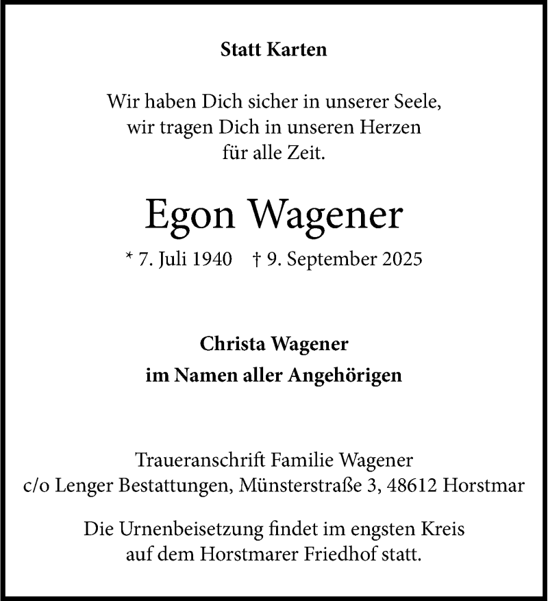 Hier finden Sie alle Traueranzeigen aus der Zeitung, die bisher für Egon Wagener erschienen sind. Weitere Traueranzeigen, die in der Zeitung erscheinen, werden hier ebenfalls aufgelistet