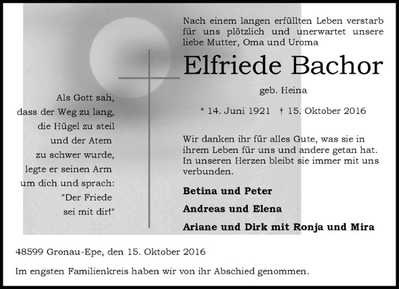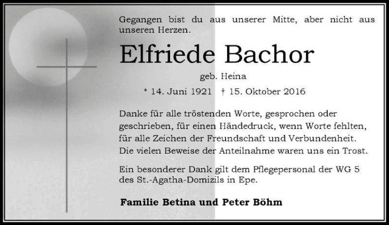 Hier finden Sie alle Traueranzeigen aus der Zeitung, die bisher für Elfriede Bachor erschienen sind. Weitere Traueranzeigen, die in der Zeitung erscheinen, werden hier ebenfalls aufgelistet