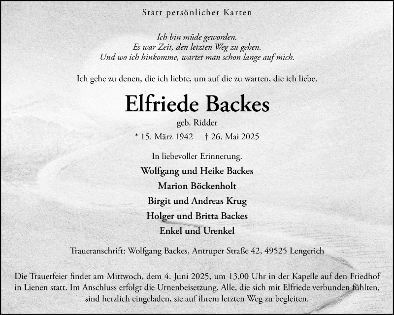 Hier finden Sie alle Traueranzeigen aus der Zeitung, die bisher für Elfriede Backes erschienen sind. Weitere Traueranzeigen, die in der Zeitung erscheinen, werden hier ebenfalls aufgelistet