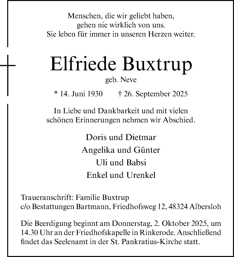 Hier finden Sie alle Traueranzeigen aus der Zeitung, die bisher für Elfriede Buxtrup erschienen sind. Weitere Traueranzeigen, die in der Zeitung erscheinen, werden hier ebenfalls aufgelistet
