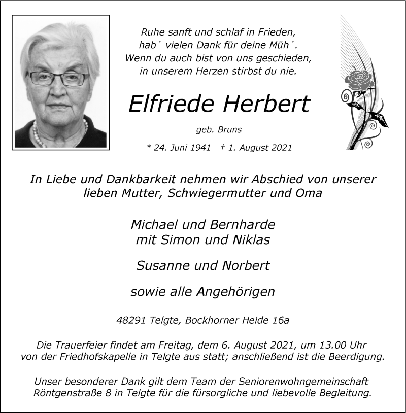 Hier finden Sie alle Traueranzeigen aus der Zeitung, die bisher für Elfriede Herbert erschienen sind. Weitere Traueranzeigen, die in der Zeitung erscheinen, werden hier ebenfalls aufgelistet