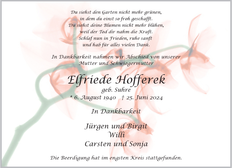 Hier finden Sie alle Traueranzeigen aus der Zeitung, die bisher für Elfriede Hofferek erschienen sind. Weitere Traueranzeigen, die in der Zeitung erscheinen, werden hier ebenfalls aufgelistet