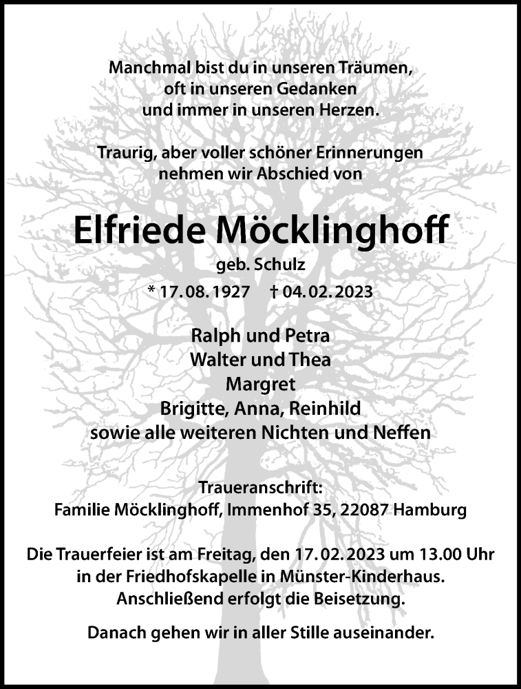 Hier finden Sie alle Traueranzeigen aus der Zeitung, die bisher für Elfriede Möcklinghoff erschienen sind. Weitere Traueranzeigen, die in der Zeitung erscheinen, werden hier ebenfalls aufgelistet