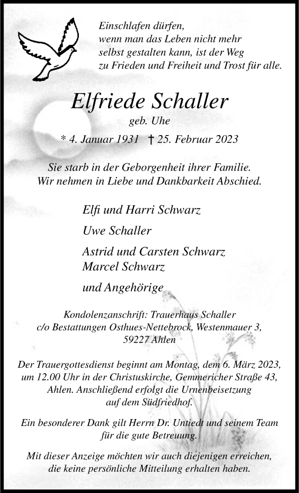 Hier finden Sie alle Traueranzeigen aus der Zeitung, die bisher für Elfriede Schaller erschienen sind. Weitere Traueranzeigen, die in der Zeitung erscheinen, werden hier ebenfalls aufgelistet