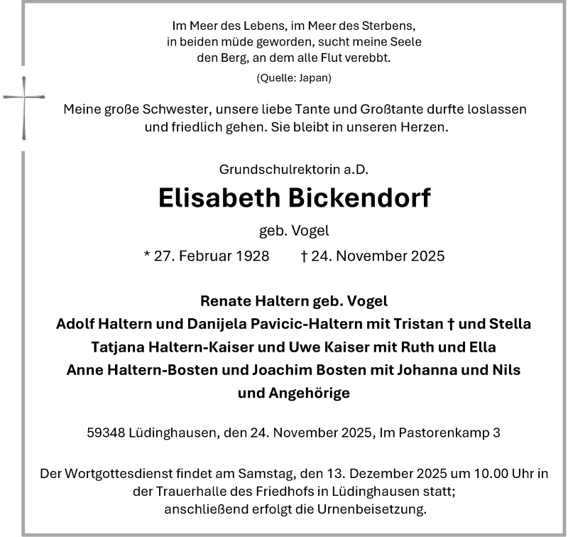 Hier finden Sie alle Traueranzeigen aus der Zeitung, die bisher für Elisabeth Bickendorf erschienen sind. Weitere Traueranzeigen, die in der Zeitung erscheinen, werden hier ebenfalls aufgelistet