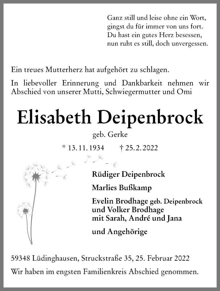 Hier finden Sie alle Traueranzeigen aus der Zeitung, die bisher für Elisabeth Deipenbrock erschienen sind. Weitere Traueranzeigen, die in der Zeitung erscheinen, werden hier ebenfalls aufgelistet