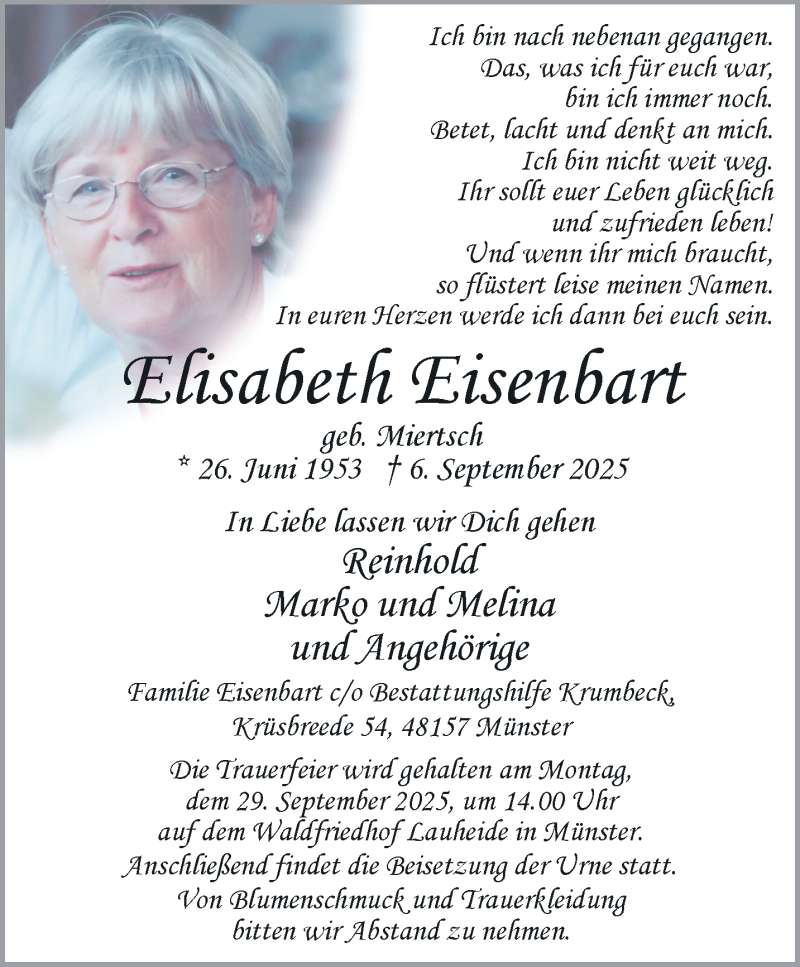 Hier finden Sie alle Traueranzeigen aus der Zeitung, die bisher für Elisabeth Eisenbart erschienen sind. Weitere Traueranzeigen, die in der Zeitung erscheinen, werden hier ebenfalls aufgelistet