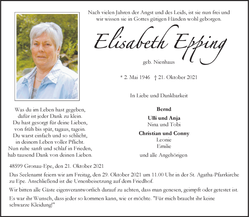 Hier finden Sie alle Traueranzeigen aus der Zeitung, die bisher für Elisabeth Epping erschienen sind. Weitere Traueranzeigen, die in der Zeitung erscheinen, werden hier ebenfalls aufgelistet