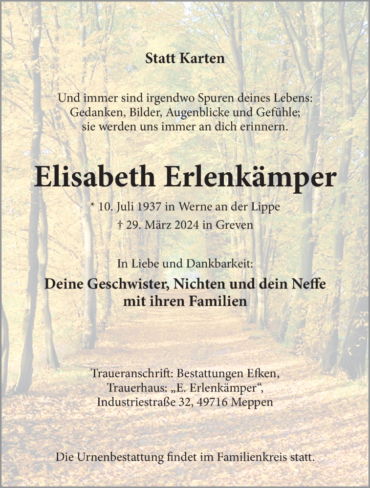 Hier finden Sie alle Traueranzeigen aus der Zeitung, die bisher für Elisabeth Erlenkämper erschienen sind. Weitere Traueranzeigen, die in der Zeitung erscheinen, werden hier ebenfalls aufgelistet