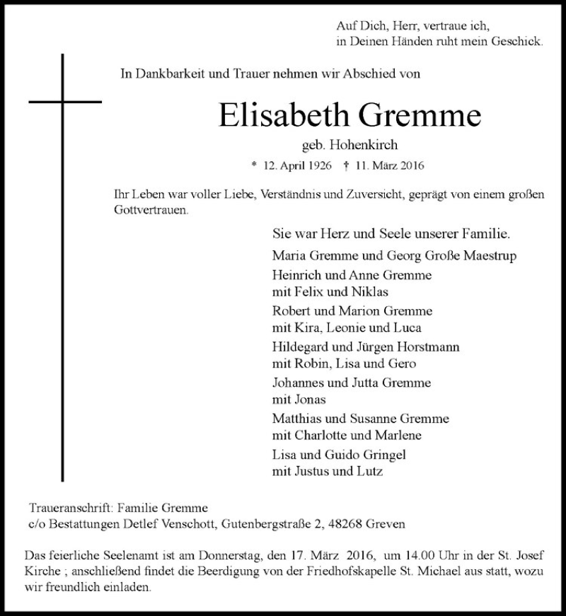 Hier finden Sie alle Traueranzeigen aus der Zeitung, die bisher für Elisabeth Gremme erschienen sind. Weitere Traueranzeigen, die in der Zeitung erscheinen, werden hier ebenfalls aufgelistet