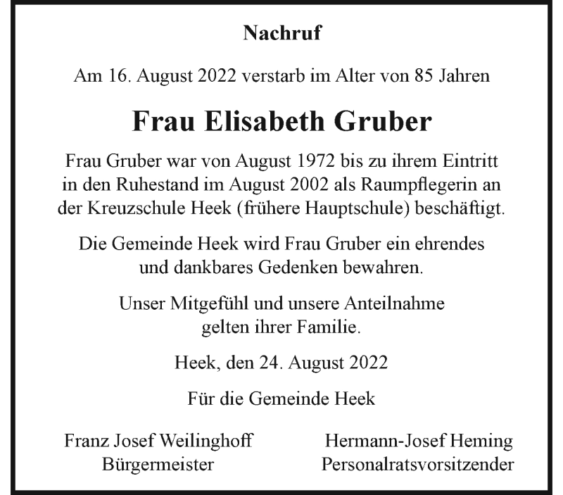 Hier finden Sie alle Traueranzeigen aus der Zeitung, die bisher für Elisabeth Gruber erschienen sind. Weitere Traueranzeigen, die in der Zeitung erscheinen, werden hier ebenfalls aufgelistet