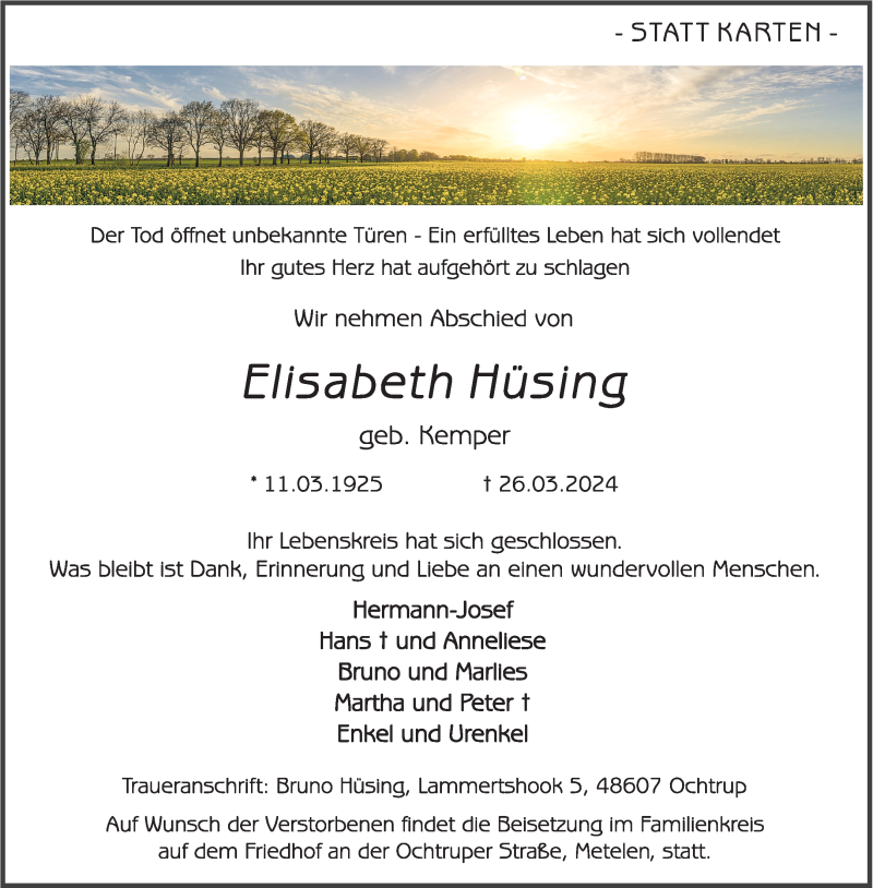 Hier finden Sie alle Traueranzeigen aus der Zeitung, die bisher für Elisabeth Hüsing erschienen sind. Weitere Traueranzeigen, die in der Zeitung erscheinen, werden hier ebenfalls aufgelistet