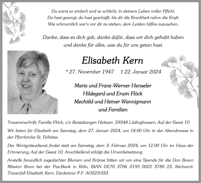 Hier finden Sie alle Traueranzeigen aus der Zeitung, die bisher für Elisabeth Kern erschienen sind. Weitere Traueranzeigen, die in der Zeitung erscheinen, werden hier ebenfalls aufgelistet