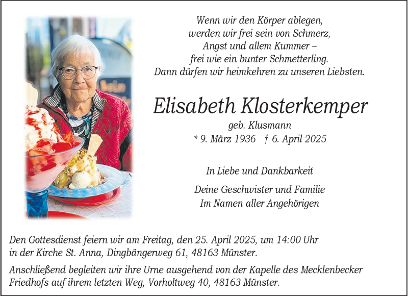 Hier finden Sie alle Traueranzeigen aus der Zeitung, die bisher für Elisabeth Klosterkemper erschienen sind. Weitere Traueranzeigen, die in der Zeitung erscheinen, werden hier ebenfalls aufgelistet