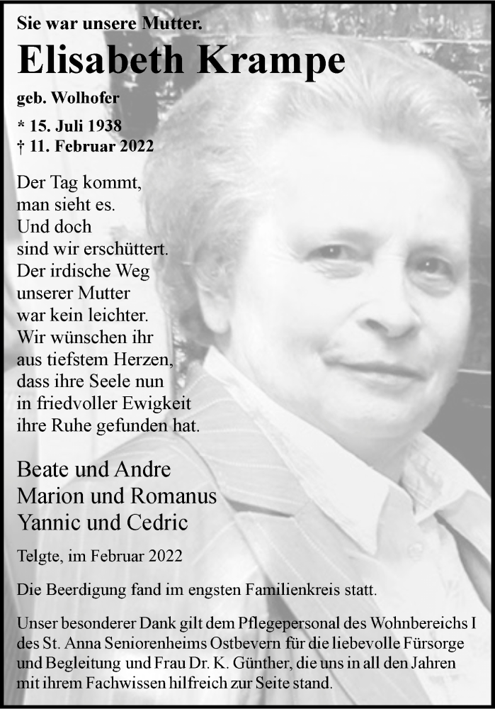 Hier finden Sie alle Traueranzeigen aus der Zeitung, die bisher für Elisabeth Krampe erschienen sind. Weitere Traueranzeigen, die in der Zeitung erscheinen, werden hier ebenfalls aufgelistet