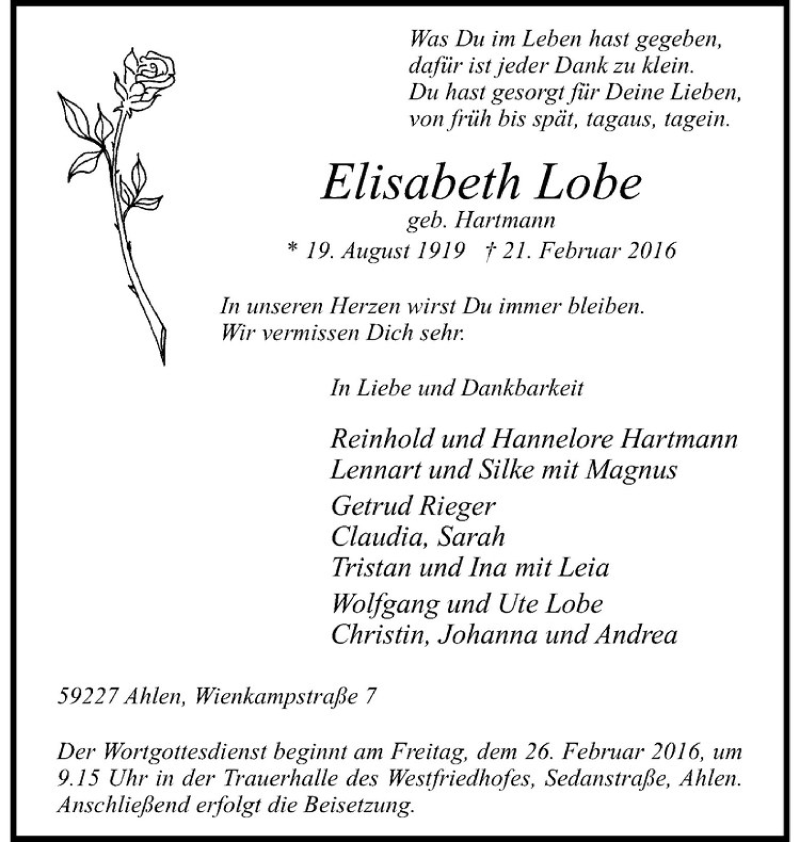 Hier finden Sie alle Traueranzeigen aus der Zeitung, die bisher für Elisabeth Lobe erschienen sind. Weitere Traueranzeigen, die in der Zeitung erscheinen, werden hier ebenfalls aufgelistet