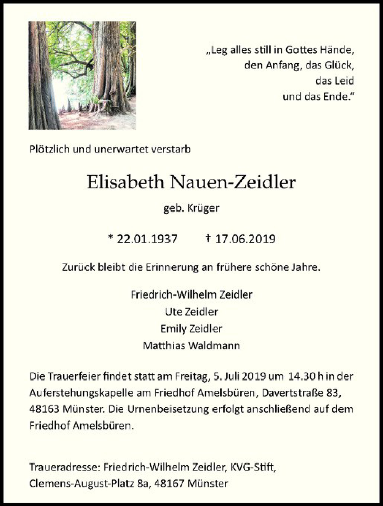 Hier finden Sie alle Traueranzeigen aus der Zeitung, die bisher für Elisabeth Nauen-Zeidler erschienen sind. Weitere Traueranzeigen, die in der Zeitung erscheinen, werden hier ebenfalls aufgelistet