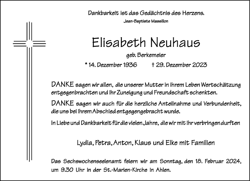 Hier finden Sie alle Traueranzeigen aus der Zeitung, die bisher für Elisabeth Neuhaus erschienen sind. Weitere Traueranzeigen, die in der Zeitung erscheinen, werden hier ebenfalls aufgelistet