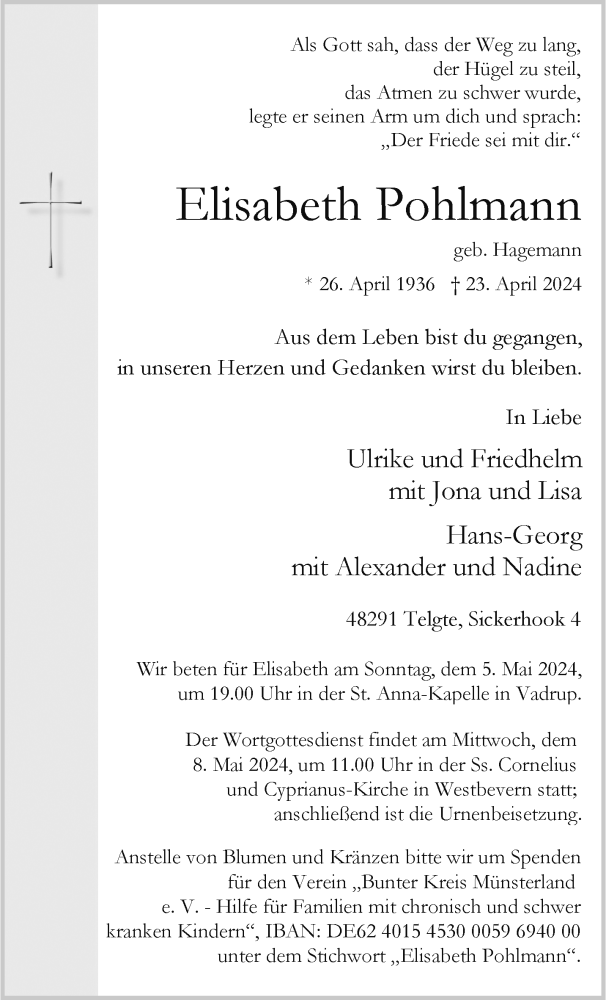 Hier finden Sie alle Traueranzeigen aus der Zeitung, die bisher für Elisabeth Pohlmann erschienen sind. Weitere Traueranzeigen, die in der Zeitung erscheinen, werden hier ebenfalls aufgelistet