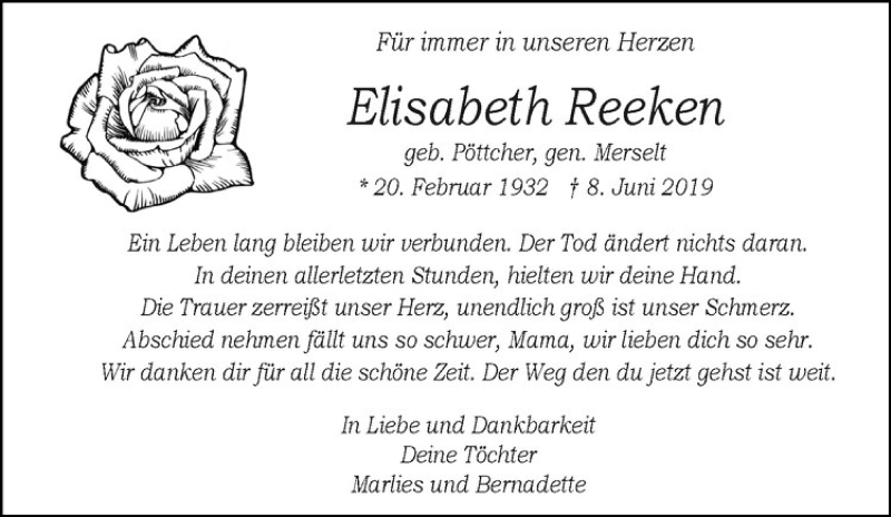 Hier finden Sie alle Traueranzeigen aus der Zeitung, die bisher für Elisabeth Reeken erschienen sind. Weitere Traueranzeigen, die in der Zeitung erscheinen, werden hier ebenfalls aufgelistet