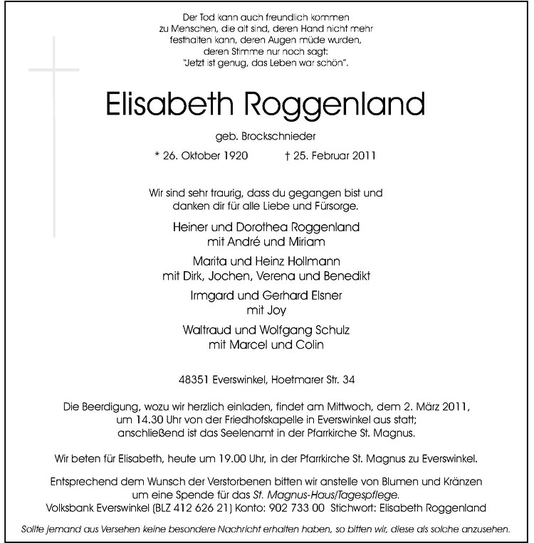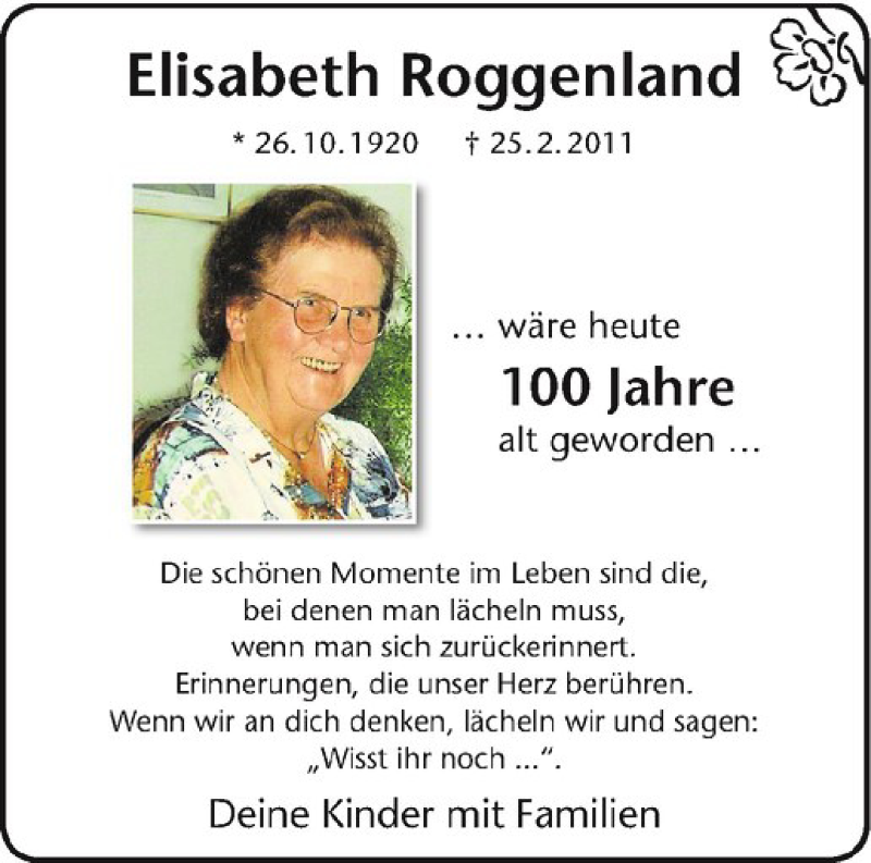 Hier finden Sie alle Traueranzeigen aus der Zeitung, die bisher für Elisabeth Roggenland erschienen sind. Weitere Traueranzeigen, die in der Zeitung erscheinen, werden hier ebenfalls aufgelistet