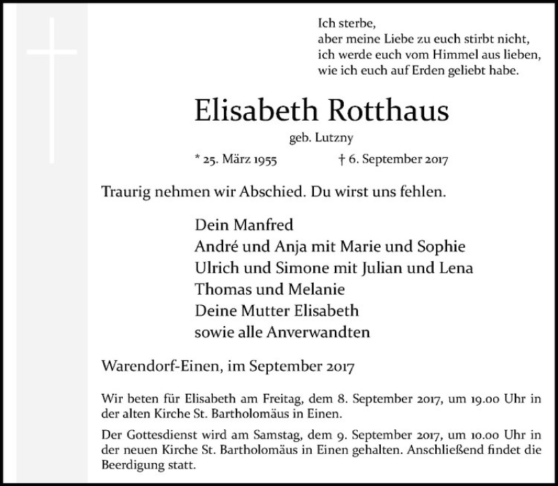 Hier finden Sie alle Traueranzeigen aus der Zeitung, die bisher für Elisabeth Rotthaus erschienen sind. Weitere Traueranzeigen, die in der Zeitung erscheinen, werden hier ebenfalls aufgelistet