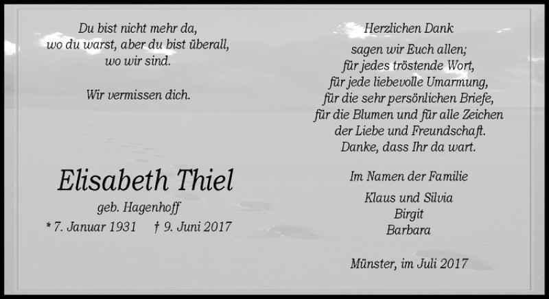 Hier finden Sie alle Traueranzeigen aus der Zeitung, die bisher für Elisabeth Thiel erschienen sind. Weitere Traueranzeigen, die in der Zeitung erscheinen, werden hier ebenfalls aufgelistet
