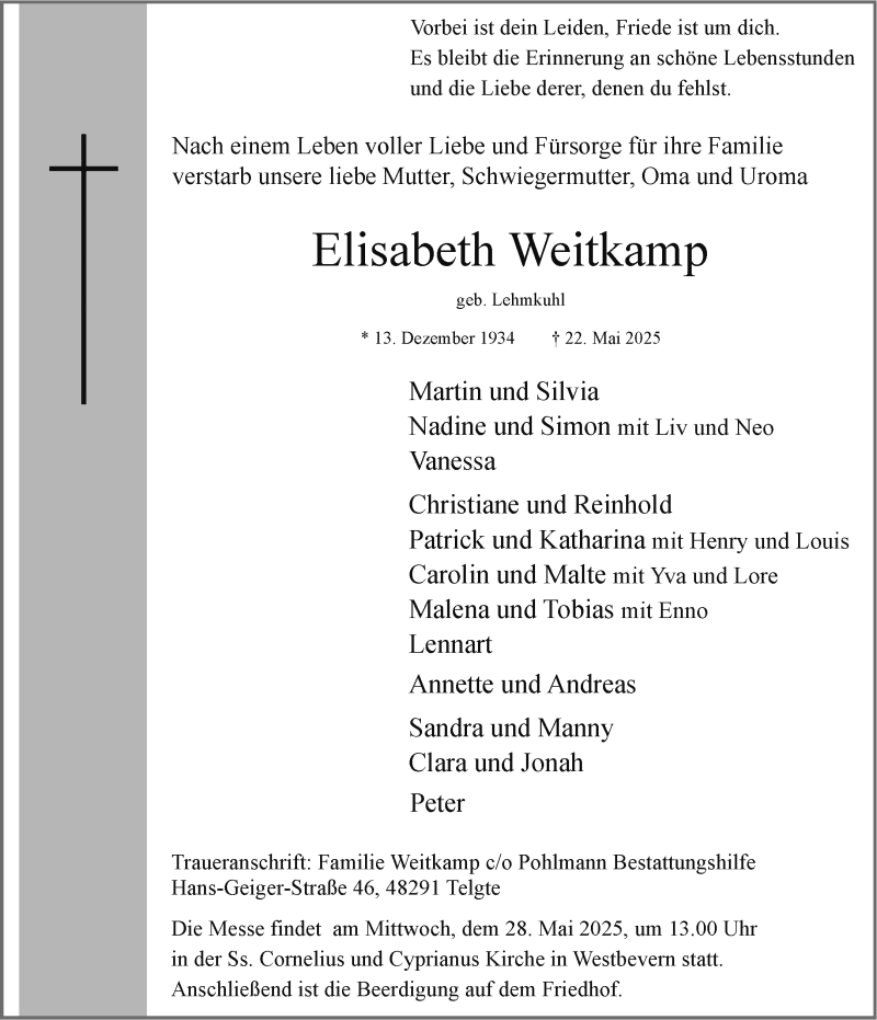Hier finden Sie alle Traueranzeigen aus der Zeitung, die bisher für Elisabeth Weitkamp erschienen sind. Weitere Traueranzeigen, die in der Zeitung erscheinen, werden hier ebenfalls aufgelistet