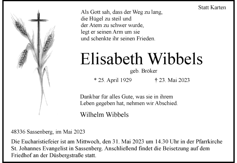 Hier finden Sie alle Traueranzeigen aus der Zeitung, die bisher für Elisabeth Wibbels erschienen sind. Weitere Traueranzeigen, die in der Zeitung erscheinen, werden hier ebenfalls aufgelistet